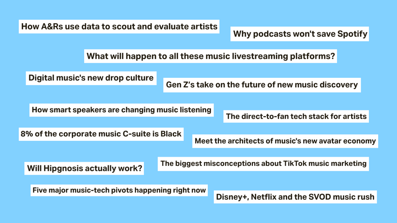 - In the past 12 months, we’ve published over 100 articles, research databases and podcast recordings, on topics ranging from livestreaming, DSPs and record labels to music’s role in adjacent fields like brand partnerships, podcasts, video games, institutional finance and, of course, blockchain.