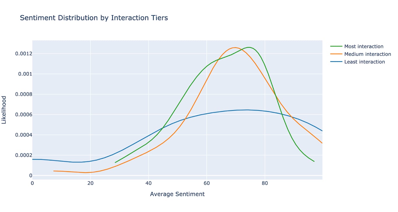 However, our findings don’t support this hypothesis. We split the NFT drops into three equally large buckets according to their engagement values (most, medium and least engagement). As pictured below, we plotted the fan sentiment distributions for all three buckets side-by-side. In this plot, the horizontal axis represents the % positive sentiment value, while the vertical axis represents that sentiment value’s likelihood.