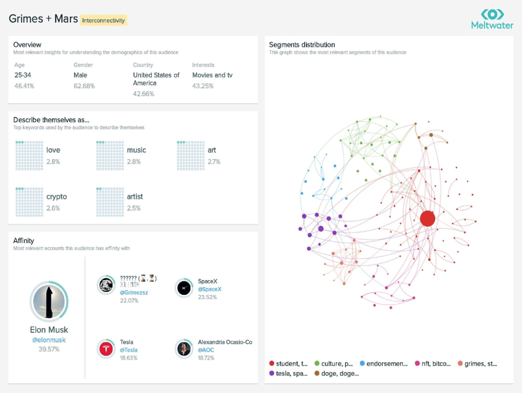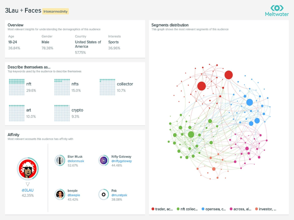The Meltwater audience visualization for 3LAU’s Faces drop, pictured above, shows clear audience clusters that imply a more positive or at least more engaged relationship with crypto. Names of these clusters include “trade/accounts,” “nft collectors/degen,” “opensea/creative” and “investor/ape.” Similarly, the top keywords these audiences use to identify themselves on Twitter lean heavily on the crypto art landscape (29.5% for “NFT,” 15.0% for “NFTs,” 10.7% for “collector,” 10% for “art,” and 9.3% for “crypto”).