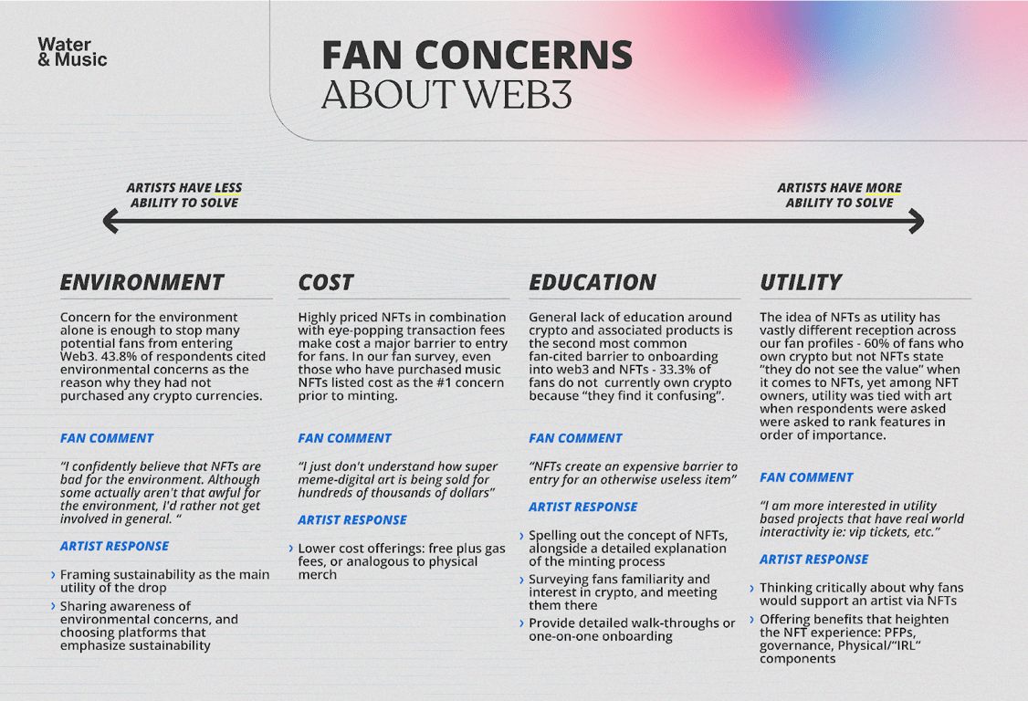 Despite the astounding amounts of money that artists have raised through music NFTs in the last year alone — and the hope that parts of the industry have placed in them as the future of creative monetization — NFTs remain the subject of much debate. Mixed reactions to music NFTs are commonplace not only among industry professionals but also among music fans themselves, with key concerns ranging from environmental unsustainability to high financial barriers to entry and the perception of being scammed.