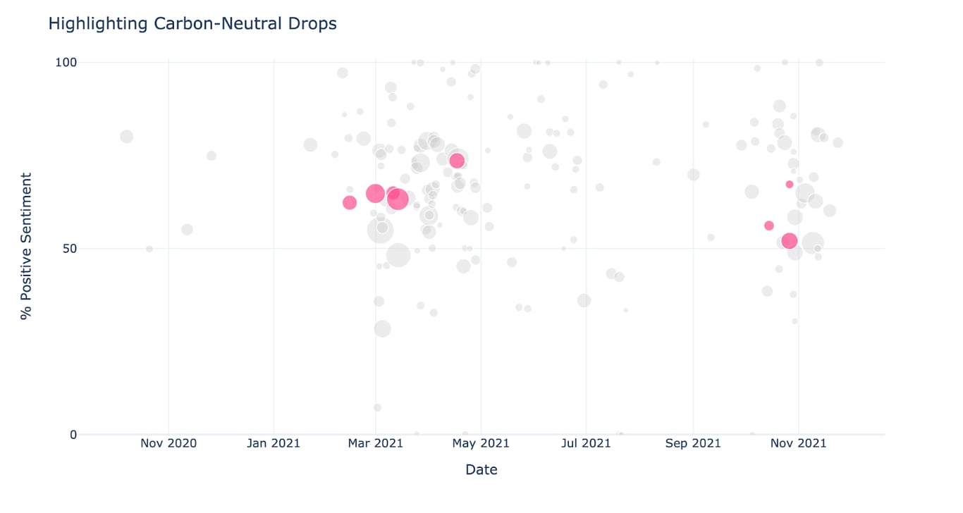 When we tag NFT drops/projects by mentions of environmentally conscious or carbon-neutral initiatives, the average positive sentiment seems to lean slightly higher than the general trend (see below) — but we have too little info on carbon-neutral drops in our dataset to know for sure whether this difference is statistically significant. And similar to the charitable tack-on issue discussed above, leaning too heavily on sustainability rhetoric in marketing an NFT drop risks framing sustainability alone as the drop’s only utility, at the expense of the quality of the actual fan experience. As we cover in our fan onboarding article, much of the surface-level messaging around environmental concerns in NFT drop tweets and press releases glosses over additional externalities and barriers to entry that fans might face as they onboard into Web3, such as needing to purchase ETH on Mainnet and bridge it over to a secondary, lower-cost chain (like Polygon or Tezos) in order to purchase an otherwise “carbon-neutral” NFT.