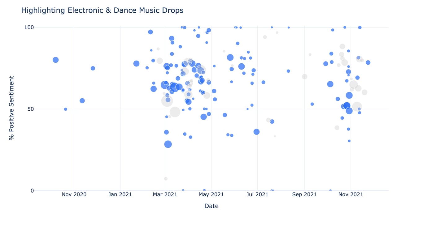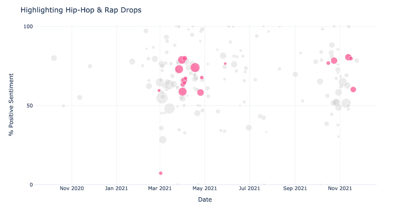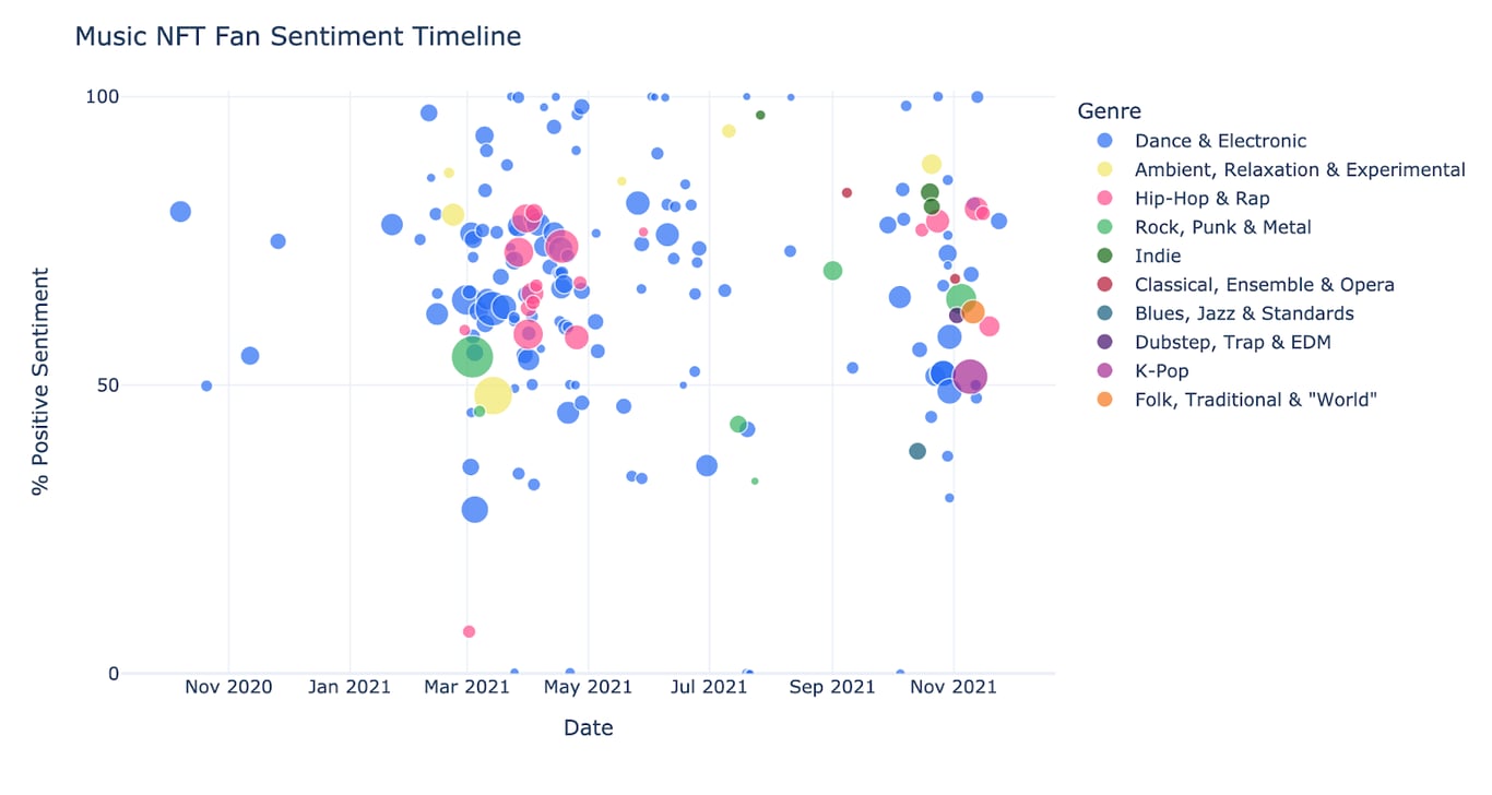 Each dot in this graph represents an NFT release. The horizontal axis represents the date of the announcement, and the vertical axis represents the percentage of interactions that registered positive sentiment. The size of each dot illustrates overall engagement on Twitter, and its color categorizes the genre of the artist, as pulled from the music analytics tool Chartmetric.