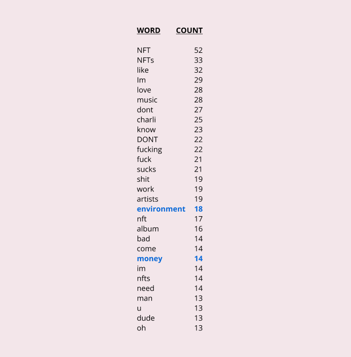 1. Twitter has not proven to be an effective platform for artists to address fan concerns around NFTs and move the needle on sentiment, especially around environmental and financial concerns. This may be because, at large, Twitter is not exactly the best platform for nuanced discussion of complex topics (who knew…).