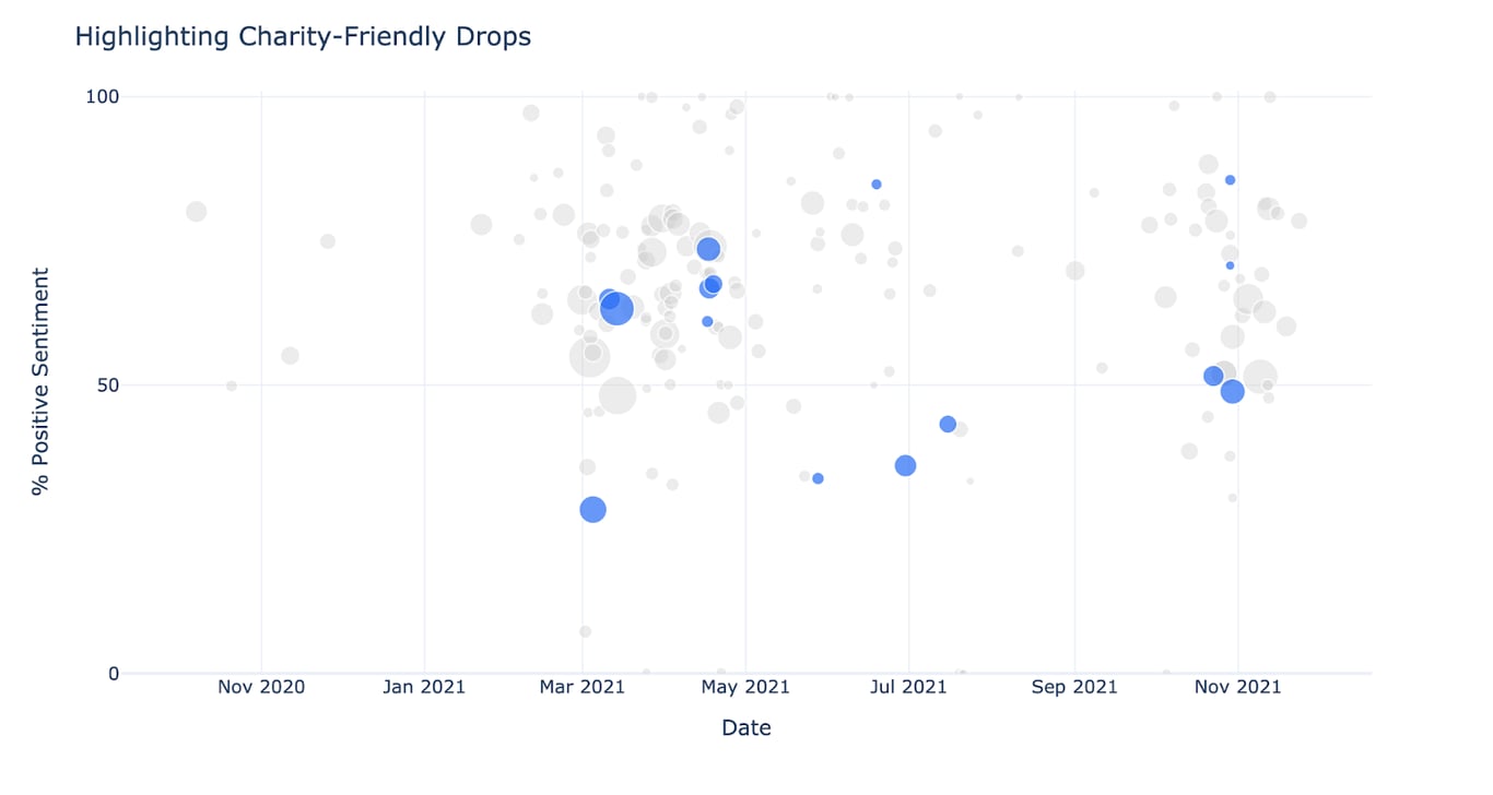 In the context of our dataset, mentions of charitable causes or intentions have little to no impact on sentiment relative to the general trend, as pictured below. In fact, a handful of NFT drops with charitable elements actually registered negative sentiment — such as Charli XCX’s drop on Foundation back in March 2021, which donated a portion of proceeds to Girls Make Beats. This sentiment roughly matches the broader music industry (and within the Water & Music community) that merely tacking a charitable element onto an NFT rollout will not do enough to quell the entire range of fan concerns about the format, and certainly does nothing to address inherent financial and technological barriers to entry that new crypto users will face.