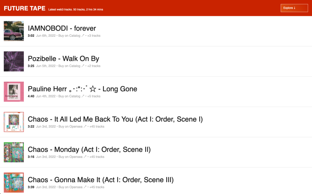 - Future Tape has released an iOS app that plays back NFT music from Catalog, Nina, and Sound.xyz, and on Friday listed the Chaos Songs NFT packs, a “headless” project of 77 artists put together by Songcamp. To our knowledge, this marks the first Web3 music player on the iOS App Store, and focuses on music discovery — offering options to arrange tracks by latest released, shortest/longest duration, and if the track is that artist’s first mint, among other categories. The app mimics the website of the same name.