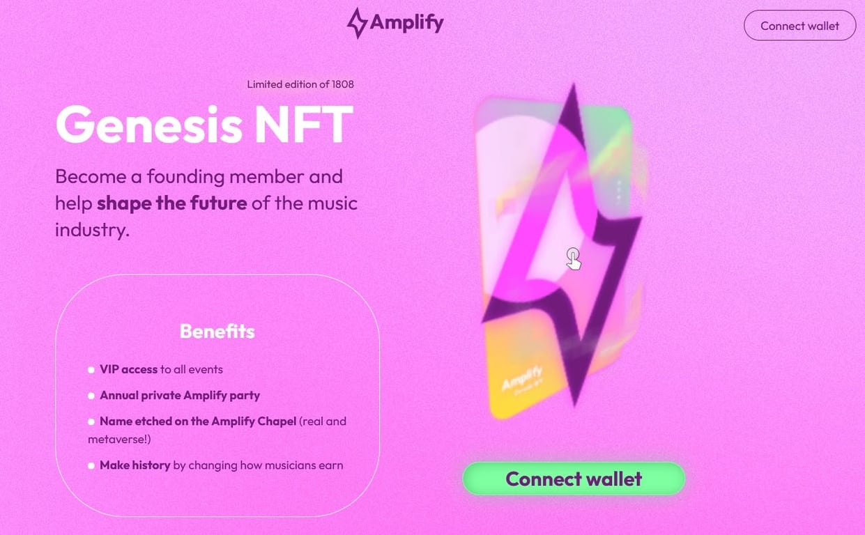 - UK-based company Amplify (pictured above), co-founded by Kasabian band member Ian Matthews, launched a genesis NFT series, offering holders lifetime VIP access to their AmplifyLive series of events, and being listed as founding members of the Amplify DAO. The events claim to be “the world’s first gig that never stops paying,” using digital merchandise NFTs to raise money for a fund shared among the promoter, venue and artists post-event.