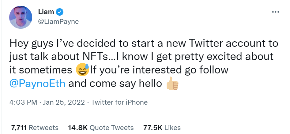 This week, Liam Payne (former One Direction member and recipient of one of the most entertaining hatchet jobs of all time) announced that he is setting up a separate, crypto-centric Twitter account, complete with an .eth-referencing handle and Doodles PFP.