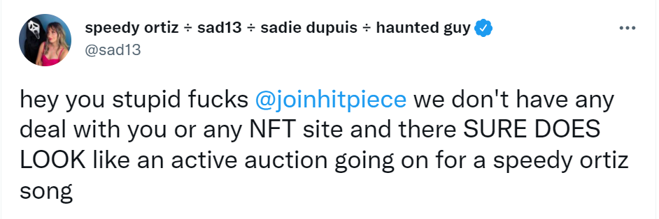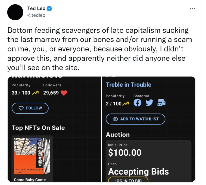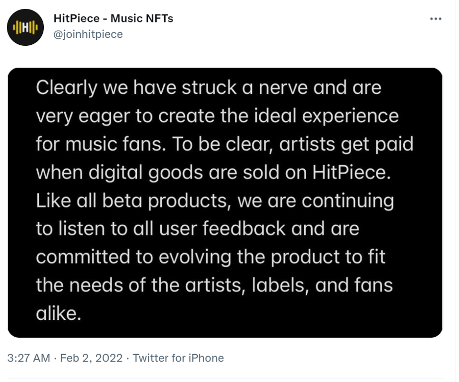 While the idea of gathering and curating information on behalf another party (with or without their permission) isn’t exactly a new business model, the fact that artists weren’t involved in any stage of this project suggests that the HitPiece team fundamentally misunderstands the level of thoughtfulness and care that goes into managing an artistic career. Many (if not most) artists see their careers as a form of pure self-expression, rather than as a profit center, and are suspicious of engaging in anything which may be read as profiteering by their fanbase. Add to this the fact that NFTs have a huge PR problem, and are a highly controversial subject for many fans and artists alike, and you have a recipe for disaster.