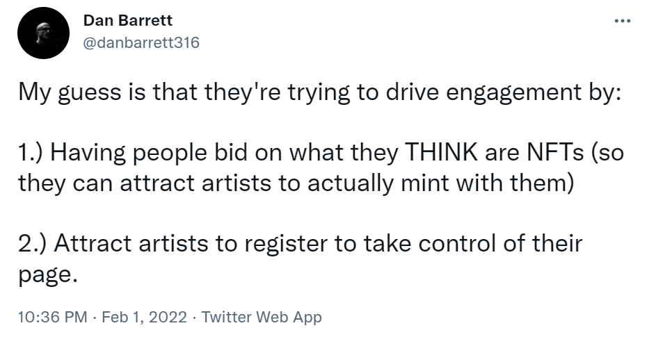 A further irony, this “experiment” was a relatively decent proof of part of the NFTs thesis. In that if the value of NFTs is derived from the social contract between artist and fan, then trying to blitzstart that without the consent of artists will fall on its face, instantly. – @danfowler