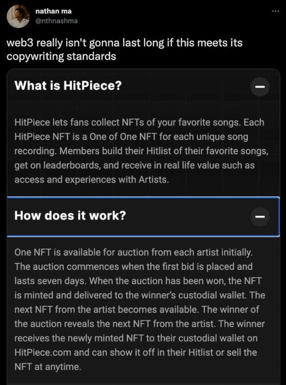 We’ve already written about how many music NFT projects fail to communicate the value of Web3 to music fans. It’s fair to say that communication issues were a key problem throughout HitPiece’s rollout.