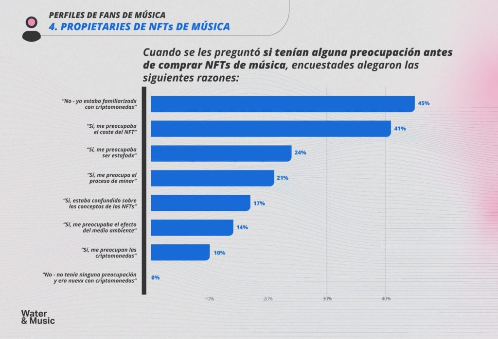 El costo es la tercera razón más mencionada por las personas encuestadas Crypto-Dudosas de por qué aún no habían comprado criptomonedas. Del mismo modo el 25 % de fans Cripto-Exclusivamente (Perfil 2) afirman que consideran que los NFTs son demasiado costosos para tomarse el tiempo de invertir (como dijo algune fan, “los NFTs crean una barrera de entrada costosa para un artículo que de otro modo sería inútil”). Incluso quienes tienen propiedad de NFT de música (perfil 4), los más orientados a la Web3 de fans que se encuestaron, mencionaron el costo como la principal preocupación antes de mintear un NFT de música. Juntos, los resultados de nuestra encuesta de fans ilustran que independientemente de la participación directa o el interés de uno en Web3 el costo sigue siendo una barrera en todo el ecosistema.