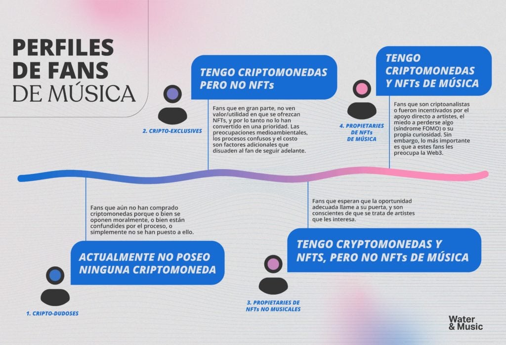 En este artículo, examinamos los métodos con los que artistes han intentado incorporar a sus fans al ecosistema musical de Web3, con el objetivo de desmentir y aclarar las ideas erróneas sobre los procesos que funcionan y los que no. Al analizar la información de una combinación de entrevistas a artistes, una encuesta de incorporación de fans y un análisis cualitativo de los comunicados de prensa, identificamos cuatro categorías clave de fans con diferentes niveles de participación en el ecosistema cripto, como también las cuatro principales preocupaciones que fans tuvieron a la hora de adoptar los NFTs de música.