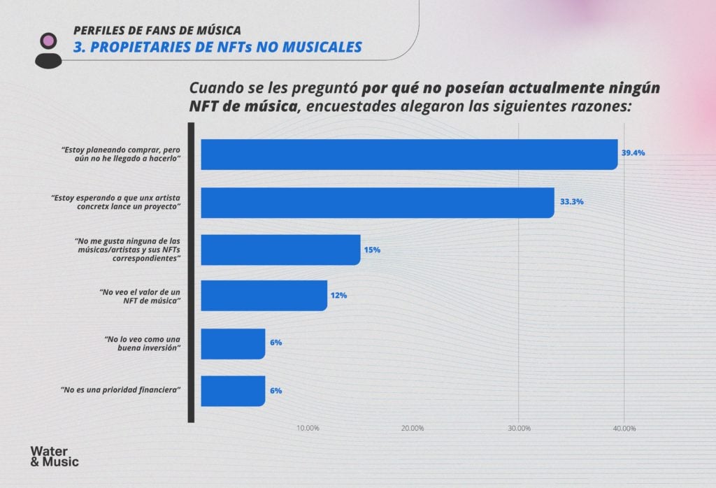 Hay cierto número de fans que han comprado NFTs que no son de música. Cuando se les pidió que consideren por qué actualmente no poseen ningún NFT de música, esta categoría generalmente dijo que está esperando que llegue el NFT de música correcto antes de participar y que quieren asegurarse de que es une artiste que les importa.