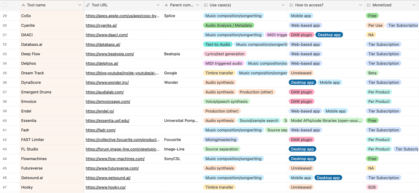 Hence, we’ve redesigned our Music AI Tools database with a new focus on tracking not only tech specs, but also market impact.