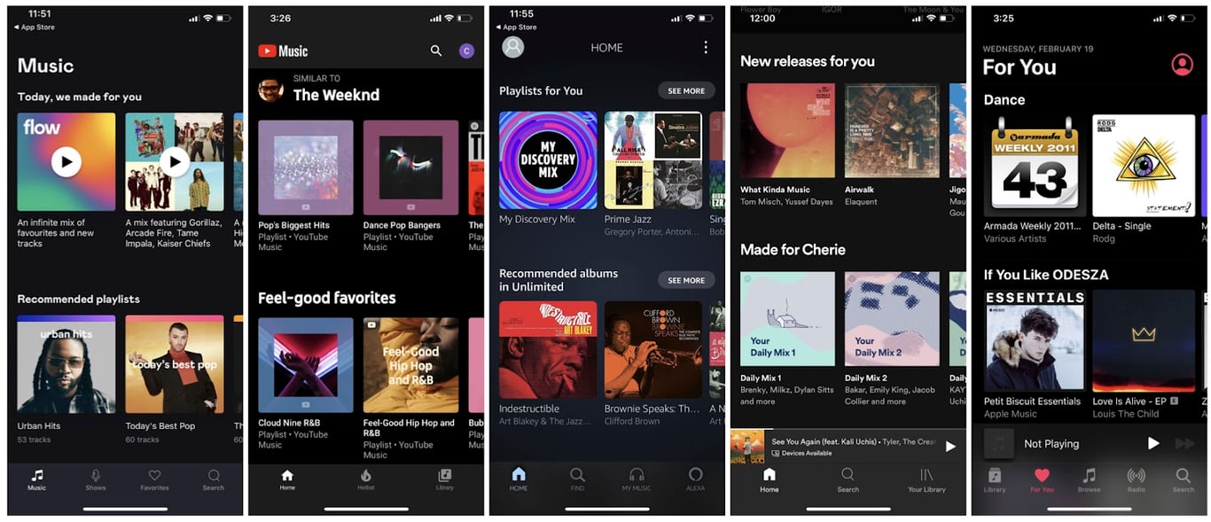 Appleby’s post inspired me to investigate this UI homogenization further. I took screenshots of the iOS homepages of Spotify, Apple Music, Amazon Music, YouTube Music and Deezer, and laid them out side-by-side.