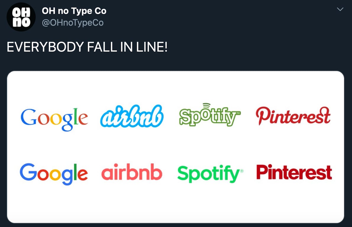 In 2016, designer Michael Horton, calling this trend “complexion reduction,” pointed out how the apps of companies like Airbnb, Instagram and Medium were all moving towards simpler icons, bolder headlines and black-and-white UIs (sound familiar?). Similarly, OH no Type Co.’s viral tweet from 2018 showed how the company logos of Google, Airbnb, Spotify and Pinterest had all morphed from unique, standout designs to much more standardized, rounded, sans-serif fonts.