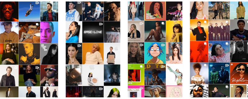 First, Jack Appleby, strategy director at R/GA, discovered that the Instagram grids of Spotify, Apple Music, Amazon Music and YouTube Music were nearly indistinguishable. As you can see in his screenshots below (included with his permission), the majority of posts on each of the grids consist of a well-known artist’s face against a white or solid-colored background — with almost no signals to help identify the services themselves.