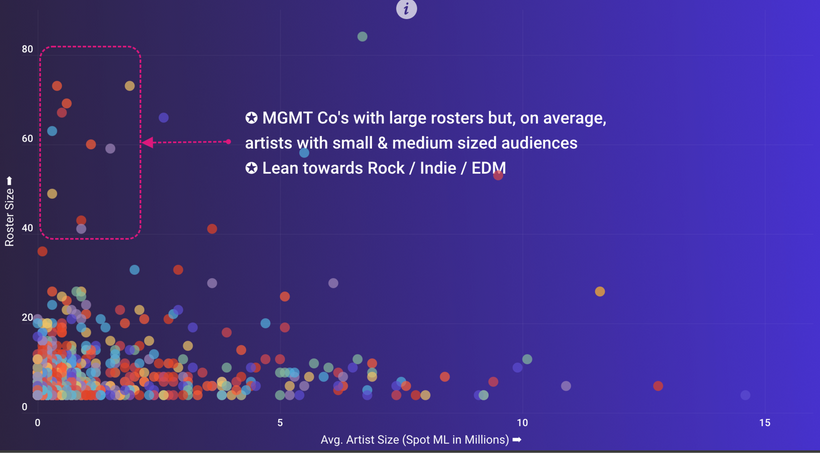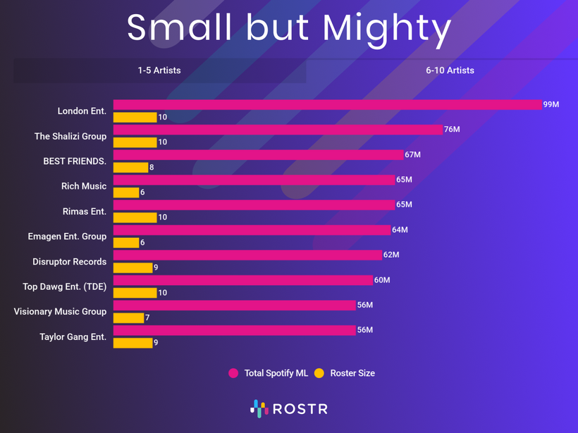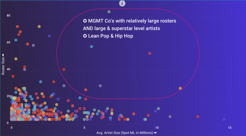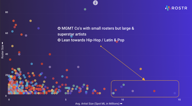 At the other end of the spectrum, you see a cluster of what ROSTR calls “small-but-mighty” management companies — i.e. those with only one to ten artists on their roster, but with outsized average audience reach per artist (>10 million monthly Spotify listeners) compared to their peer companies with larger rosters.
