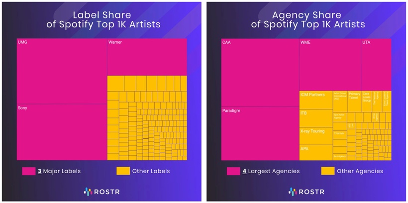 ROSTR’s first product is a free, online, searchable directory that tracks over 100,000 global relationships between artists and their labels, agents and management teams, as well as the newest signings, news and playlist placements across the industry. The startup has also been using this data to compile some interesting reports that shed light on the music business’ inherent power dynamics. In fact, you may recognize ROSTR for their viral infographic that circulated earlier this year, illustrating how the four major talent agencies alone — Paradigm, WME, CAA and UTA — booked 75% of the Coachella 2020 lineup (RIP 😞).