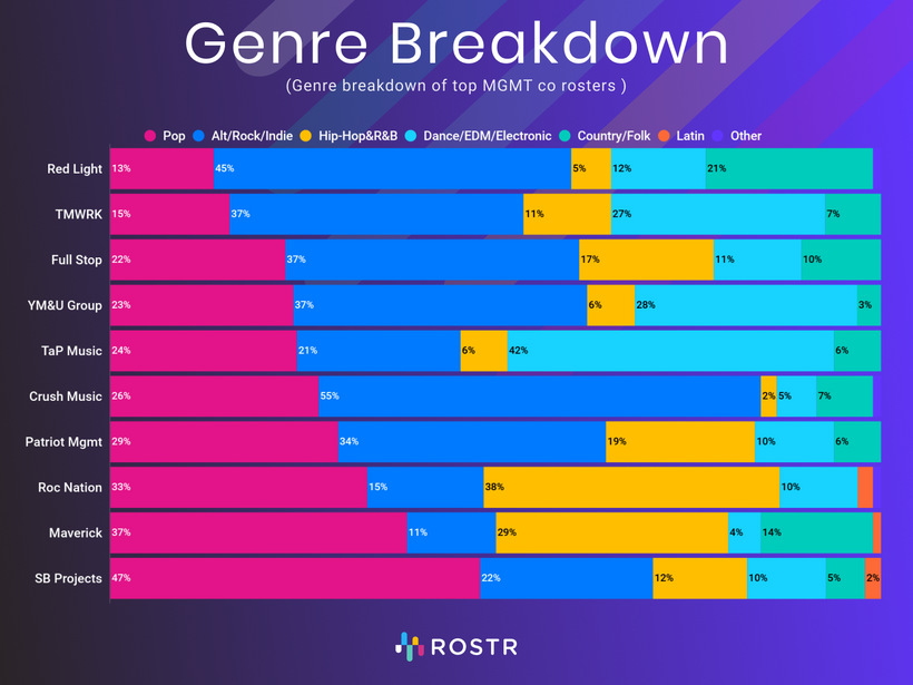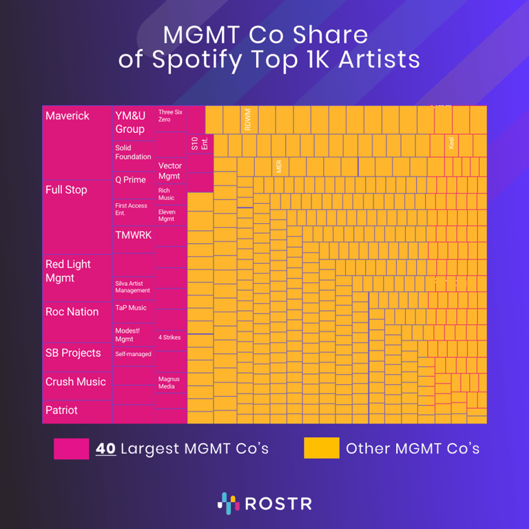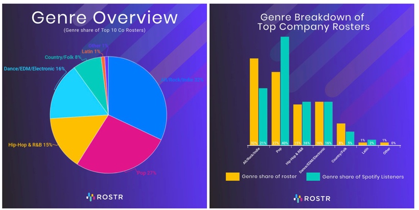 Another surprising trend in ROSTR’s data is that hip-hop remains underrepresented among the top 10 management companies relative to its consumer-facing popularity.