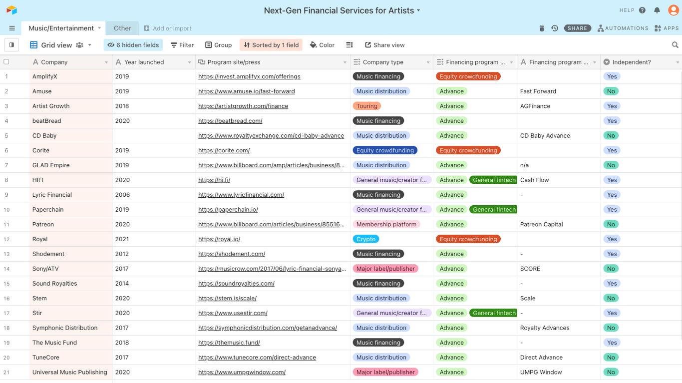 I’ll also admit that the database could do a better job of distinguishing among different financial instruments — e.g. revolving credit lines, microloans and merchant cash advances, all of which have subtle differences from each other. As of now, that distinction is especially blurry in the non-music company tab. Will also work on making that clearer.