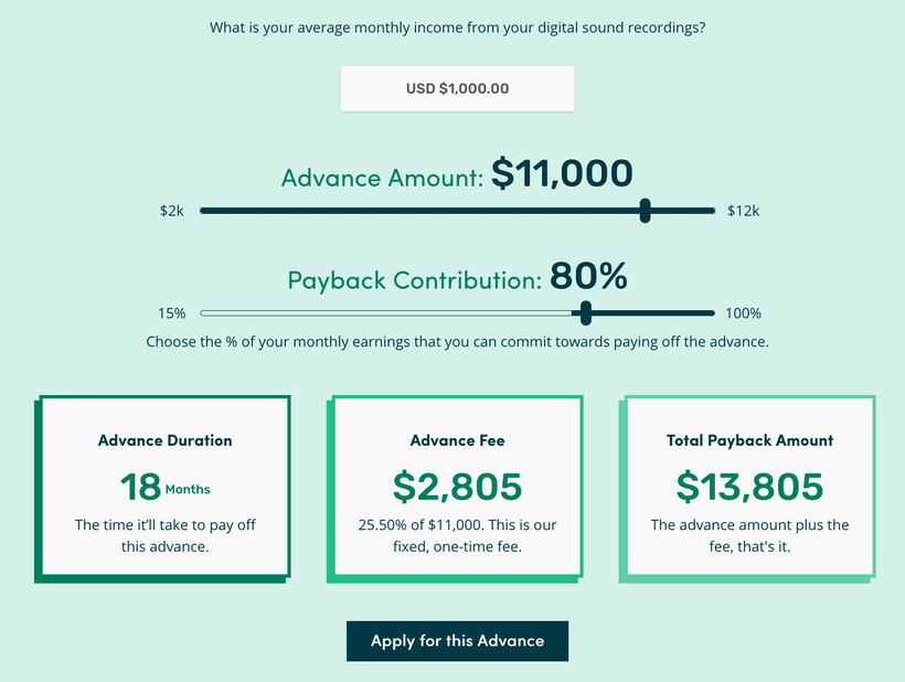 For instance, in this below screenshot from Stem’s site, they charge a 25.5% fee on a $11,000 advance that will take 18 months to pay off, based on monthly streaming income of $1,000.