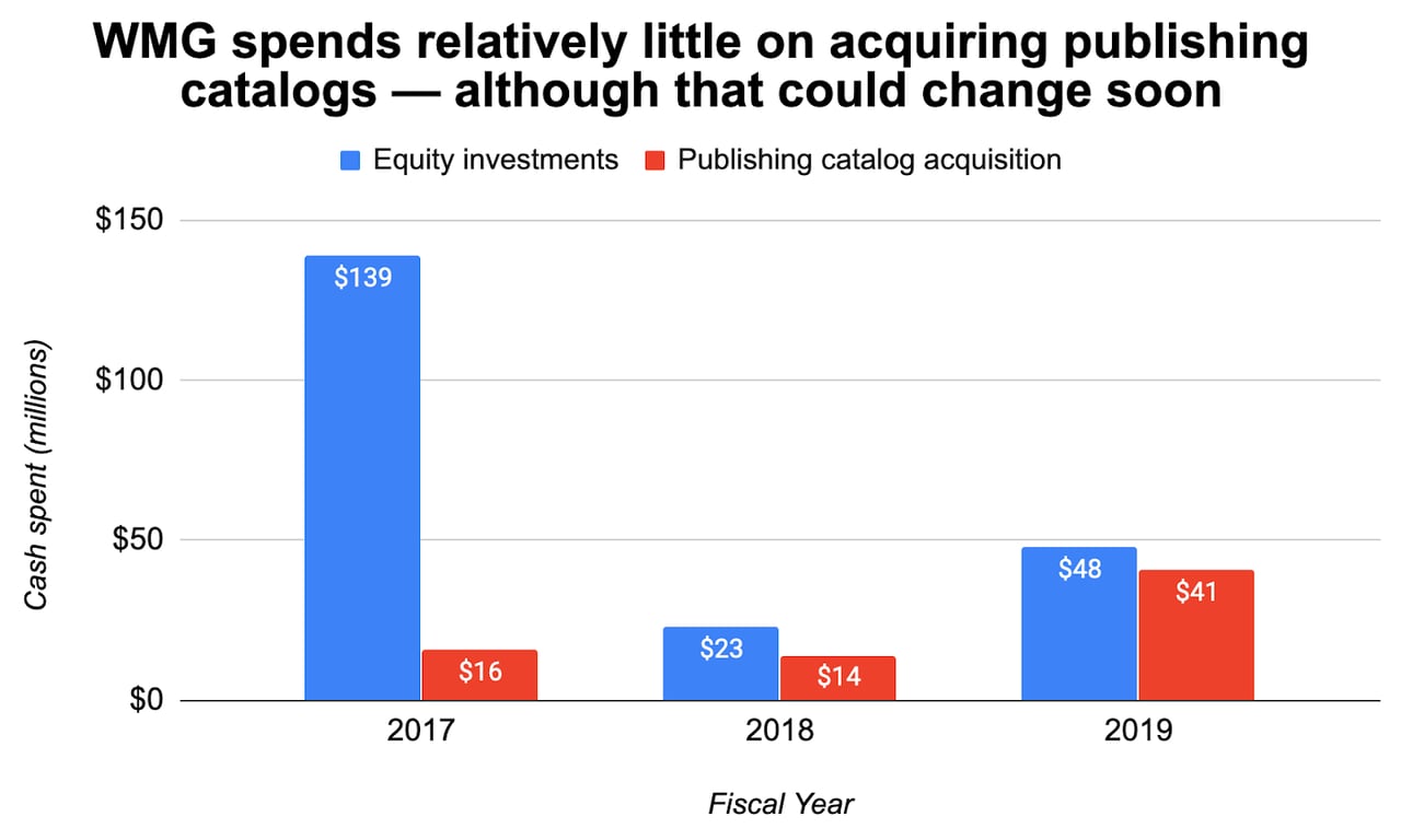 Yet, according to its filing, WMG’s spending on “acquir[ing] music publishing rights and music catalogs” totaled just $41 million in FY 2019. As a matter of comparison, that’s $7 million less than what the company spent on the “acquisition of equity investments” — i.e. on buying stakes in other companies, private or public — that same year (see chart above).