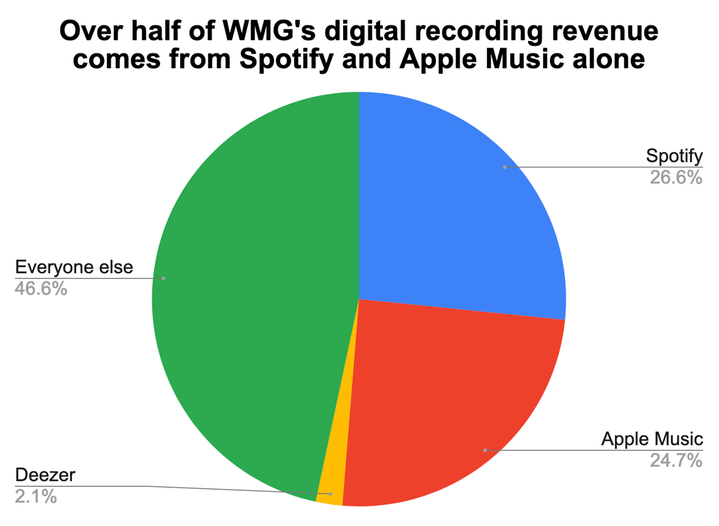 Now, thanks to WMG’s filing, we know just how much they dominate: Over half of WMG’s digital revenues come from just Spotify and Apple.