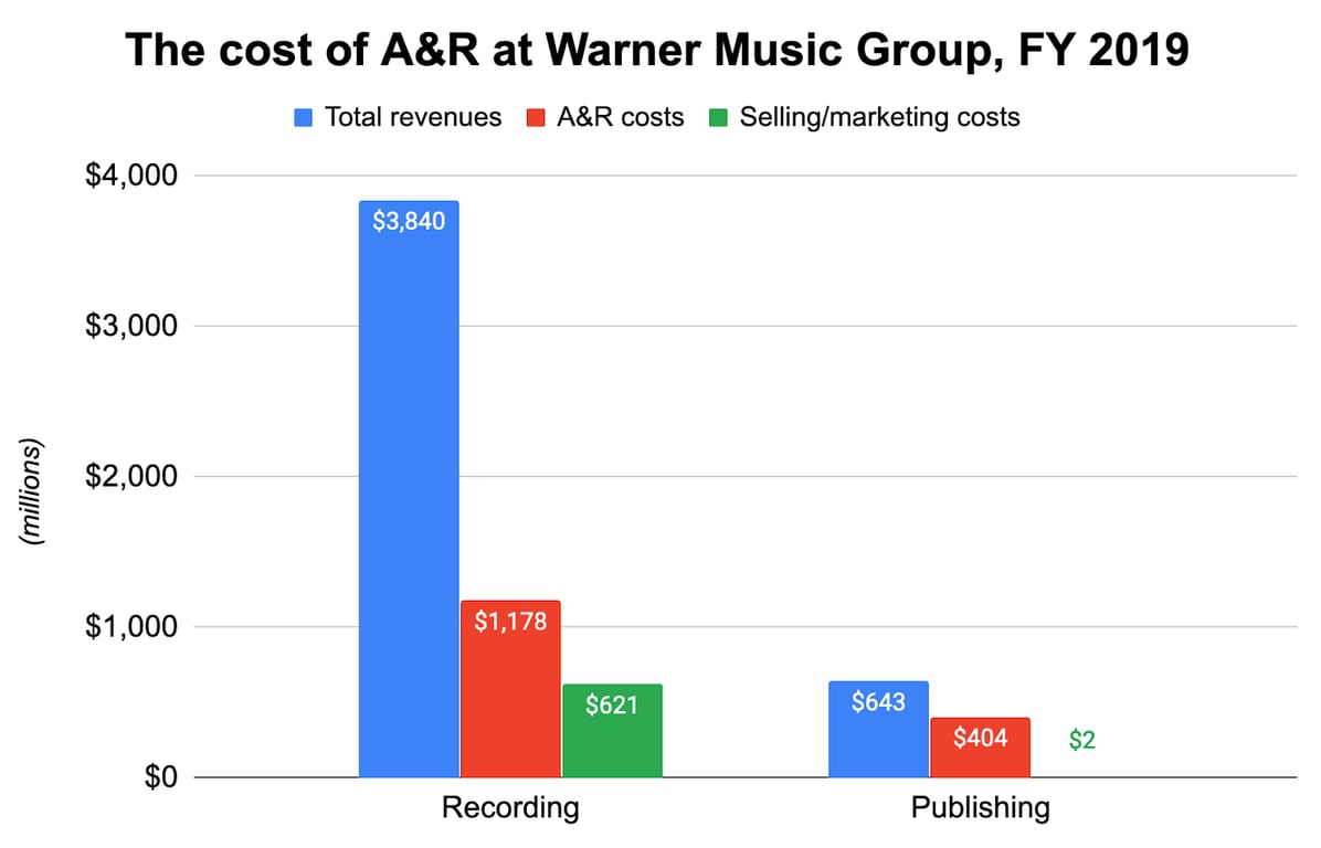 WMG’s SEC filing confirms this spending discrepancy. In FY 2019, the company spent $1.57 billion on “artist and repertoire costs” (hereafter A&R costs), versus $632 million on “selling and marketing expense” (hereafter marketing costs). In other words, WMG spent 2.5x more money on A&R than on marketing last year — pretty close to a 70:30 split.