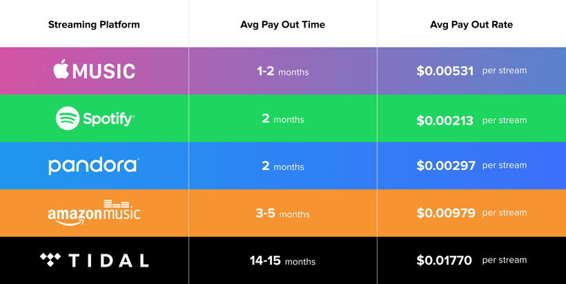 (The information displayed above includes the average payout rates and times for each service on Lyrah’s DistroKid report. Even though the royalty rates between Amazon Music Unlimited and Prime Music differ somewhat, they were combined here to represent expected rates from a mix of Unlimited subscribers and Prime subscribers. In general, royalty rates may differ based on artists’ contracts with labels or discounted plans or bundles that streaming services offer in certain markets, but this shows what an independent artist uploading their own music might see.)