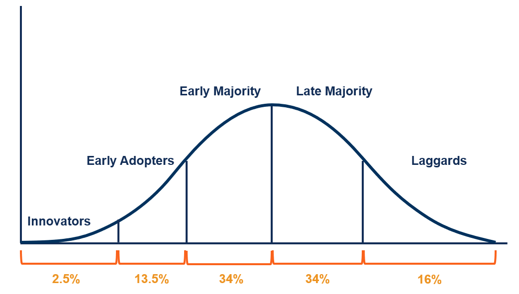 People working in music, tech and adjacent industries may already be familiar with the “diffusion of innovations” curve, which divides consumer adoption of new innovations into five different segments (innovators, early adopters, early majority, late majority and laggards):