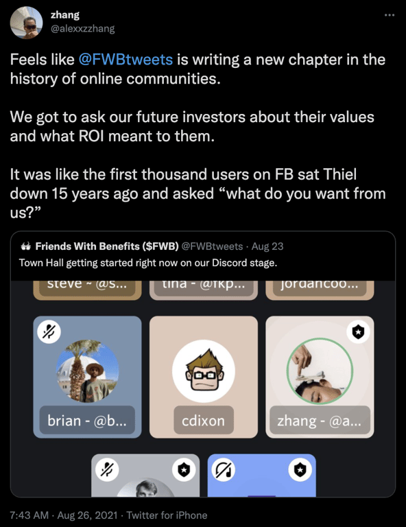Unsurprisingly, this type of activity is catching the attention of investors — but DAOs are bringing investors into the fold in radically different ways compared to what is standard in Web2. For instance, FWB recently held a community town hall to discuss a swap of a portion of the community’s tokens in exchange for $10 million in USDC (a digital stablecoin pegged to USD) from investors including Andreessen Horowitz. This is extraordinary not only because FWB is little more than a tokenized Discord community with some basic tooling (for now), but also because the community was actively involved in determining whether or not the investors were right for the collective as a whole.