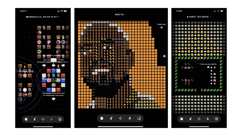 Unsurprisingly, there are more startups than incumbent tech corporations that are interested in innovating around social audio as a creative format in this way. For instance, Sonar (pictured below) is a social app built not just on live audio, but also on spatial audio (i.e. the audio you hear will depend on where you are spatially in a given room; each user is represented by a dot and can move around the room freely), as well as on a visual layer that anyone can customize with emojis. I’ve seen people use Sonar for all-out emoji-based art exhibitions, theater auditions with blocked-off “waiting rooms” and legit language lessons in virtual classrooms complete with chairs and whiteboards. There is a strong sense of exploration, discovery and spontaneous connection in Sonar that Clubhouse seems to be clinging onto right now.