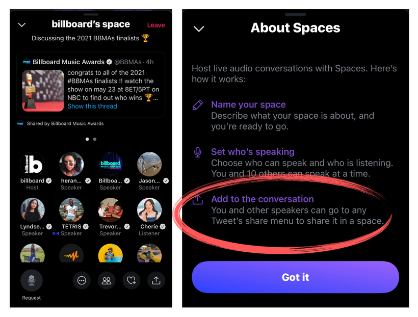 Similarly, Twitter Spaces allows hosts to display tweets at the top of their rooms, to provide additional context that is native to the social platform, and that listeners can browse simultaneously while the live Spaces audio plays in the background. See, for instance, how Billboard embedded tweets at the top of their recent Spaces discussion about the Billboard Music Awards finalists: