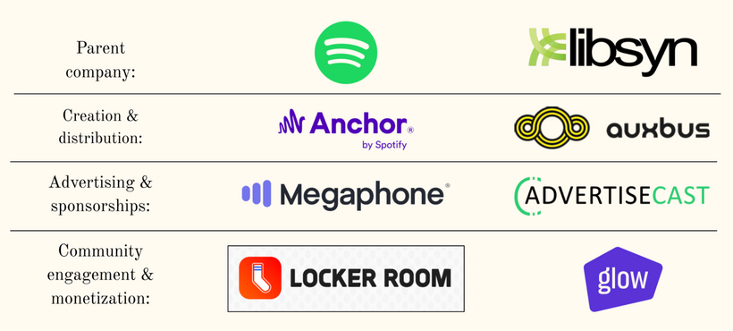 (Note that many of the above platforms can fall into more than one category — e.g. Anchor is approaching an all-in-one platform combining advertising and community engagement/monetization tools, in addition to podcast creation and distribution.)