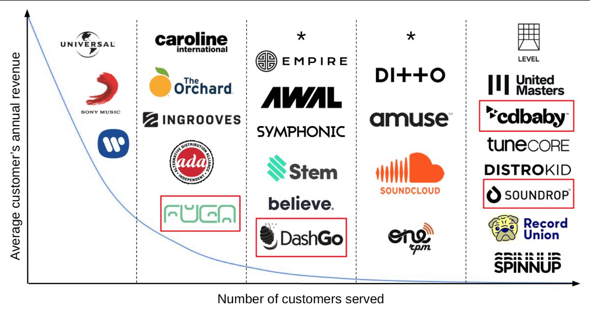 Taking all of the above information into account, here’s an updated map of the music distribution market. I added the logos of Equity, Secretly, Entertainment One, LANDR, Beatchain and ReverbNation, while putting a dotted-red box around all the companies that are powered by FUGA on the backend, to better illustrate Downtown’s reach in the landscape: