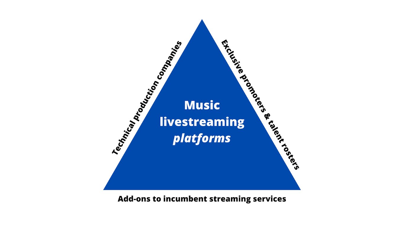 I see three potential futures for music livestreaming platforms, which can also be laid out in a triangle as pictured below: