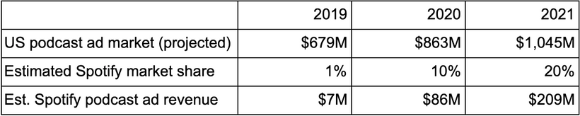 Assumption: Spotify will be the major player in podcast distribution and thus be able to capture most of ad marketing spend.