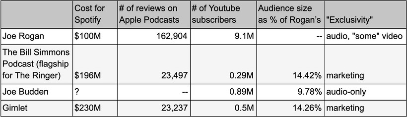 Michelle Obama’s and Addison Rae’s podcasts represent truer exclusive content for Spotify. Though their respective clout is huge, they are first-time podcasters and it’s much more uncertain as to how their shows will perform, so we will leave them out of our calculations at this time.