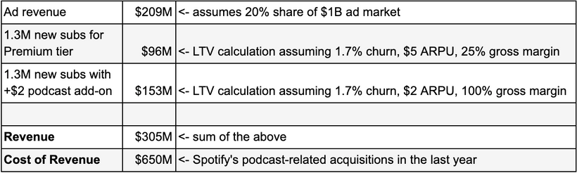Even in the rosiest of scenarios, Spotify will have already spent more than double their maximum theoretical podcast-related revenue on acquisitions alone.