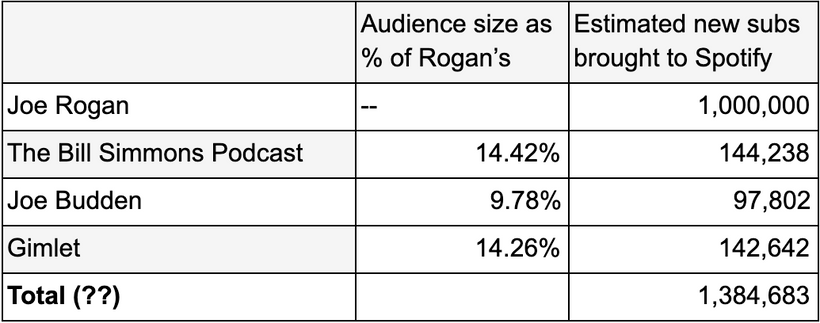 To be clear, this is a gross overestimate of new subs attributed to high-profile podcast acquisitions: