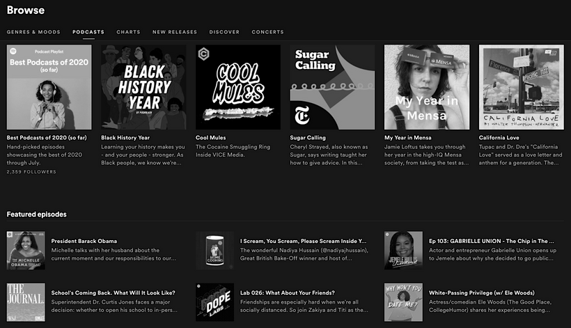 - Marketing exclusive: Content is branded as a Spotify Original or other partnership (e.g. Dissect), but still freely distributed everywhere (e.g. to competing platforms like Apple Podcasts and Stitcher).
