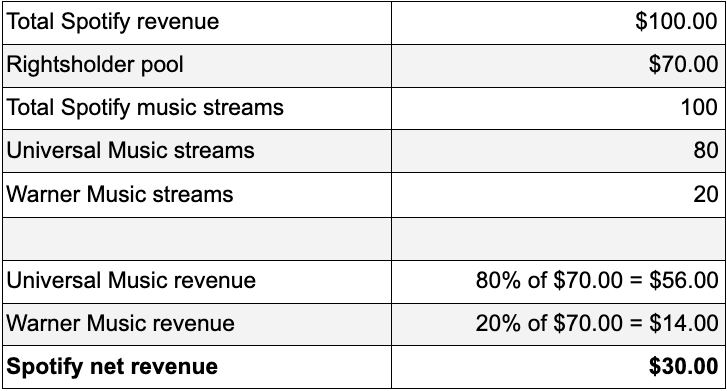 Let’s look at a hypothetical example. Say in a given month, Spotify earns $100 in premium off of 100 streams; 80 of those streams are for Universal Music Group catalog, with the remaining 20 going to Warner Music Group catalog. In the music-only world, based on the 30/70 Spotify/rights-holder split, Spotify would keep $30, Universal would get $56 and Warner would get $14.