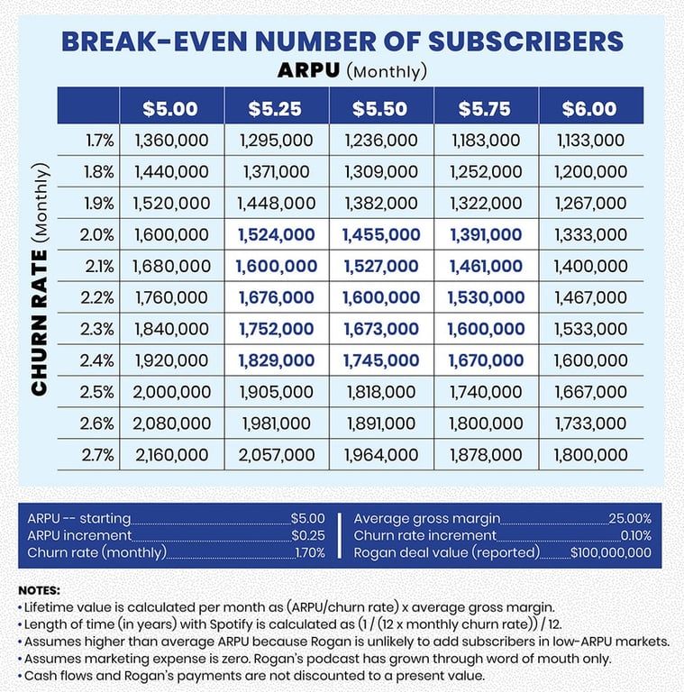 Billboard recently published a piece on how many new subscribers Joe Rogan alone would have to bring in for Spotify to break even on their $100 million deal (summary graphic below).